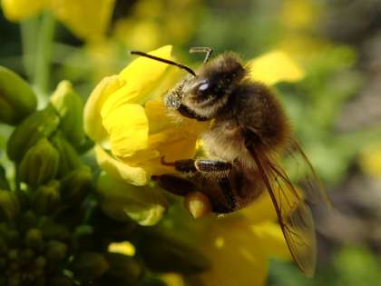 八幡ファームでは菜花がたくさん咲いています。そこには蜂たちがたくさんやってきています。一番多いのが、西洋ミツバチ。働き蜂は全て雌。産卵管が変化した針を持っています。あまり刺すことはありませんが、危険を感じると刺すこともあります。
