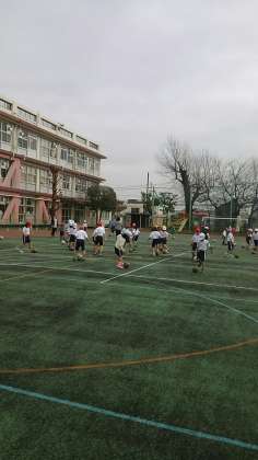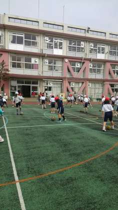 ボール蹴りゲームをやっています。一人一つのボールを上手くコントロールできるようにいろいろな動作を取り入れ活動させていました。この後シュート練習がありました。
