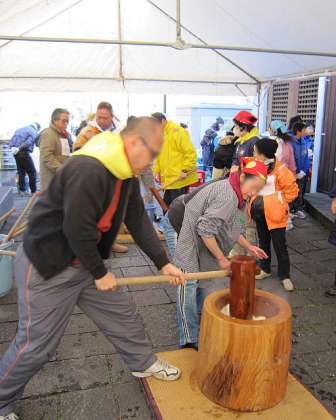 8日の始業式の後、学校はすぐに3連休となりました。その1日目の9日(土)、九品仏浄真寺参道で、新春を祝い毎年恒例、青少年九品仏地区委員会主催の餅つき大会が盛大に行われました。地域の本校関係者の方々、本校PTA、おやじの会、餅のつき手に応募してくださった方々が多数参加し、餅の準備から餅つき、販売、出店まで大活躍でした。8時30分から準備が行われ、八幡中学校生徒ボランティアと九品仏ボランティア会も交えて、朝から大忙し。餅の販売の準備ができた頃に開会式が行われご来賓の皆様の年頭のあいさつがありました。