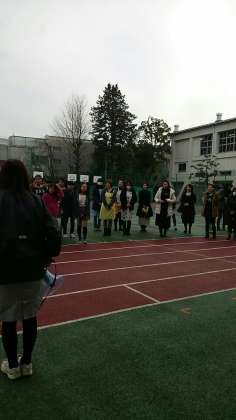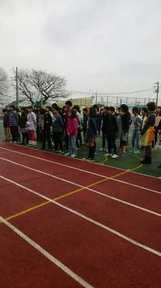 八幡小学校の校庭で同窓会の方手作りの焼きそば、おやじの会の方が炭びで焼き肉、ボラ会、PTA 保護者の協力で行われます。開会式が始まりました。