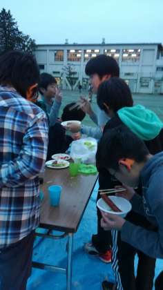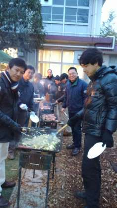 炭火焼きの肉を子どもたちは嬉しそうに食べています。お父さん方もなれたものです。