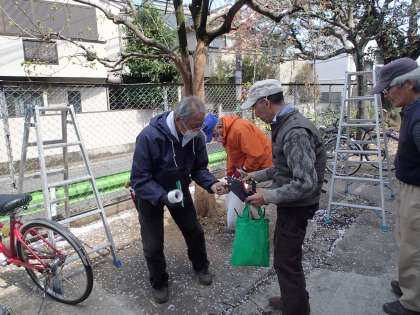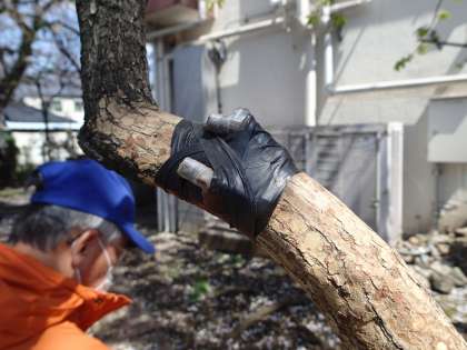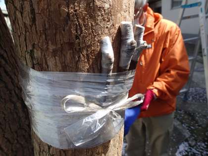 八幡ファームだけではなく、学校全体の植物の管理をして下さっているGPSの皆さんが、渋柿の枝に甘柿の枝をついでくださいました。芽を出す確率は高くはありませんが、一つでもくっついてくれると甘い柿を作ることができます。最低、1ヶ月程度はかかります。結果を楽しみにしています。