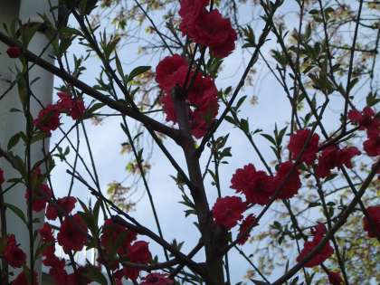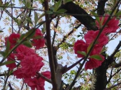 最近、八幡の樹木の確認をしていますが、花が咲いて初めて気がついたのが「ハナモモ」。学校の道具小屋の裏にひっそり育っていました。でも、花は本当に派手!