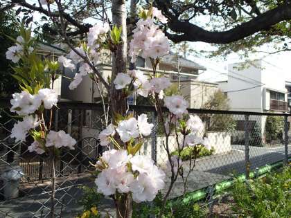 そこで、新しい桜を植えて更新を図っています。この八重桜は名前が特定されていませんが、花の様子から「糸括(いとくくり)桜」かと思われます。通用門の横に咲いています。自転車を駐輪するときにぜひご覧下さい。