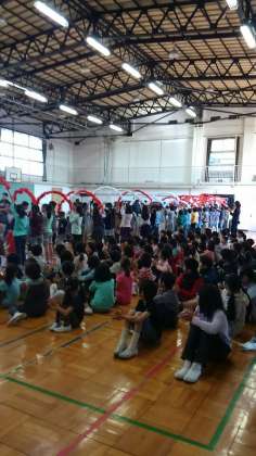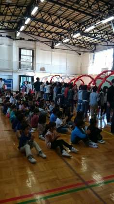 1年生を迎える会が始まりました。花のアーチを6年生と1年生が手をつないでくぐります。