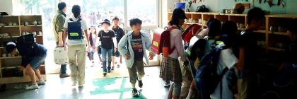 変更後の場所は、校庭のトラックの内側として、チャイムと同時に走らずに昇降口に入り、きちんと靴のかかとをそろえて靴箱にいれ、走らずに教室に向かうよう指導しています。