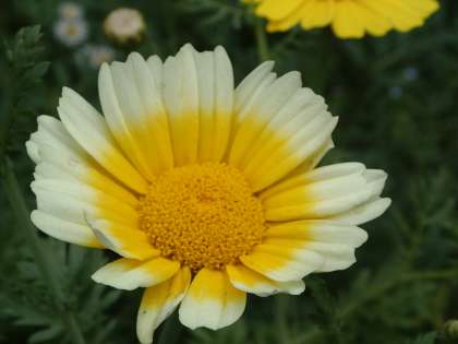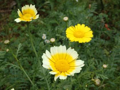 八幡ファームには様々な植物が育っています。その中に野菜の「春菊」があります。その株に花が咲きました。とても美しい花だったので、紹介します。これだったら花用として育ててもいいですね。