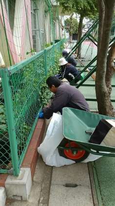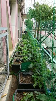 ヘチマ、きゅうり、ゴーヤのつるが伸びてきてフェンスからでてきているものは、中の網に戻したり、周りの雑草を取り除いたりする世話が必要です。今日は主事さんが手分けしてやってくださいました。有り難いです。
