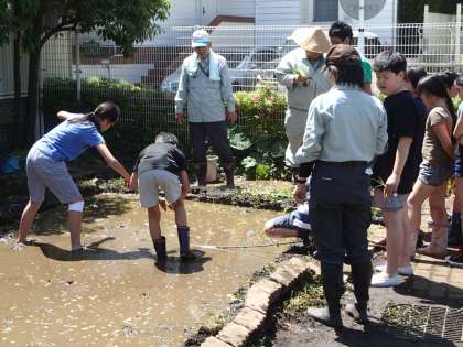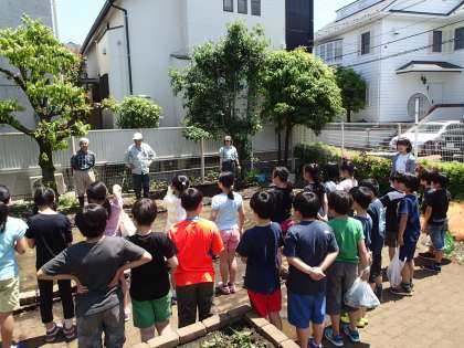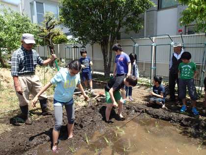 毎年、世田谷目黒農協の方々にお願いして、お米作りのサポートをしていただいています。今年はGPSの方々にもご協力をいただき、田植えを行いました。