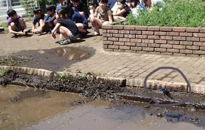 5年生が田植えをしている最中に、ツバメがやってきました。毎年、この田んぼから枝や泥を運び、巣を作ります。今年も、人間を怖がらずに地面に降りてせっせと運んでいきました。