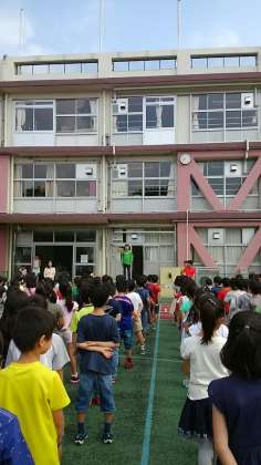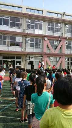 全校朝会、校長先生の話は、時刻を守るための方法を工夫すること。6年生のスピーチは、経験したことから学び、これからの目標を発表しました。代表委員会から運動会スローガン「自分の100%を越えてみんなで一歩をふみだそう!」の取り組みについて説明がありました。