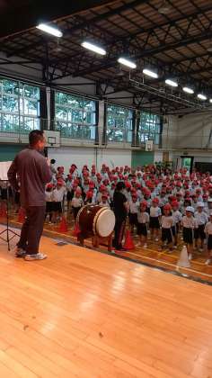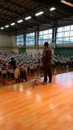 雨のため体育館で全校練習をしています。開会式隊形に集合し、基本姿勢、運動会の歌、校歌、応援合戦練習、はじめの運動を学びます。