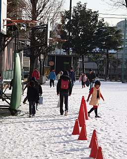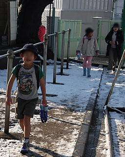雪がつもった2日の登校風景です。道の途中で雪を集めてくる子。滑らないようにこわごわ歩く子。雪の中半袖半ズボンで元気に登校する子。様々ですね。