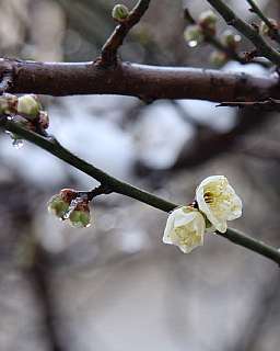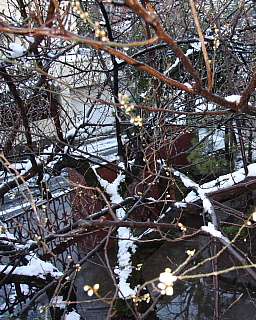 正門前の梅の花がほころびました。先週末からの暖かさに誘われてつぼみがほころんだのでしょう。この日つもった雪と白梅。風情があります。