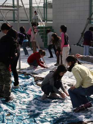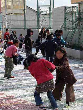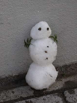 子どもたちは思い思いの遊びに夢中です。中には造形遊びに熱中している子も。少ない雪をかきあつめて作ったのは、やはり定番の雪だるまでした。