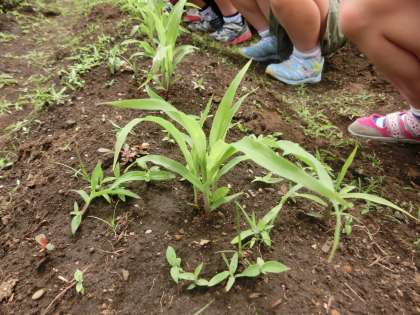 芽が出ていたので、今回の授業ではトウモロコシの様子を観察しに行きました。