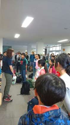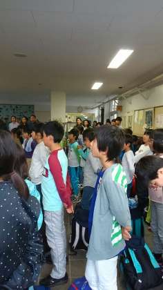 雨が降っているため、昇降口で帰校式が行われています。元気で過ごせた2泊3日の移動教室でした。