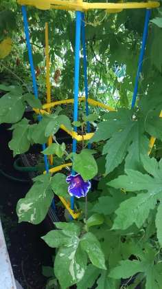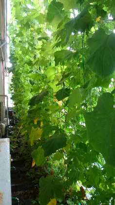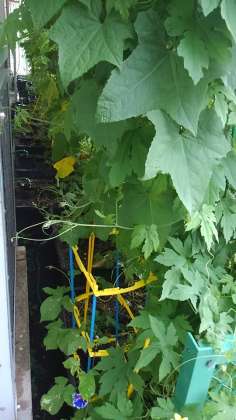 内側には、朝顔が咲き始めました。ヘチマや、きゅうり等の葉が生い茂り涼しげです。
