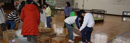 15日(月)、先週行われた展覧会の片付けを行いました。午前中に各学年が展示物を教室に引き上げた後、午後、6年生が机やいすなどの撤去作業と、体育館備品の復旧作業をしました。力を合わせがんばる6年生です。