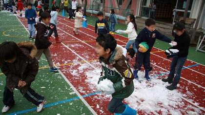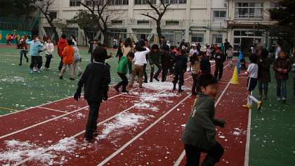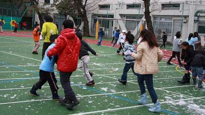 18日(火)、朝に積もったフワフワの雪をキープして中休みは雪合戦・・・と思っていたところ、予想より暖かくなったため、その頃には雪はすっかり融けて一部に残るのみでした。とても残念でしたが、子どもたちは少ない雪で雪合戦をしたり、雪玉を作ったり思い思いに楽しんでいました。一緒に遊んでいる先生が、雪玉を持った子どもたちに追いかけられるというほほえましい場面も。みんなが除雪?!してくれたおかげで、校庭の雪はまもなくすっかり消えてしまい、すぐに体育ができる状態になりました。
