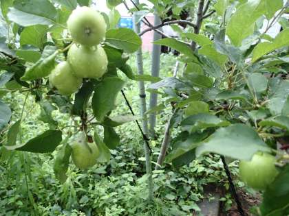 アルプス乙女とは姫リンゴの種類です。小さいけれど、真っ赤になり、甘さも抜群です。1本では実がなることは少ない種類ですが、今年は10個程度の実をつけています。来年はもう少したくさんなるといいですね。