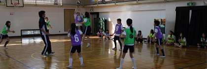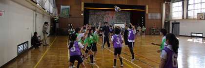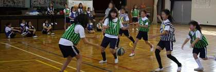 体育館では女子バスケットボール、一進一退の熱戦です。お互いのチームに熱い声援がとんでいました。