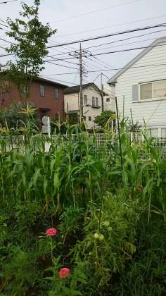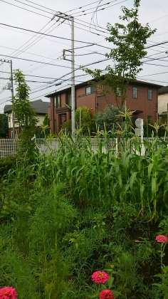 八幡ファームは、青々としています。トウモロコシ(ポップコーン)も、花盛りです。
