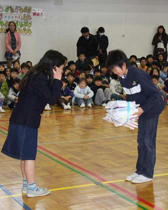 席に戻ってさっそく手紙をひらく子どもたち。つづいて、お礼として6年生から手作りのぞうきんが5年生代表に渡されました。