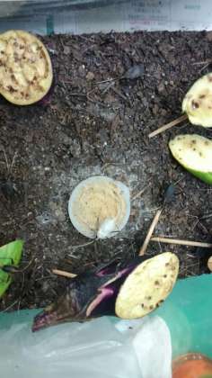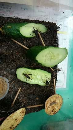 鈴虫がにぎやかに鳴いています。餌を交換すると直ぐによってきます。脱皮してまだ羽が白い雄の鈴虫がいました。
