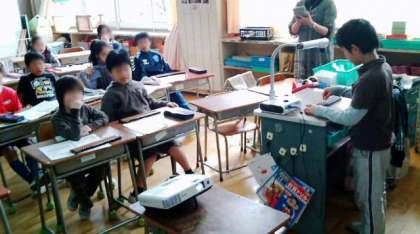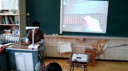 3年生の算数で、そろばんの使い方の学習をしました。黒板のスクリーンにプロジェクターでそろばんを映しだし、わかりやすくする工夫をしています。