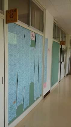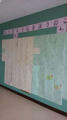 PTA からだされた夏休みの宿題です。ありがとうと言われたときの気持ち。どんなときに使っているか。家族と話し合い記入します。本日役員の方が展示してくださいました。是非、ご覧ください。