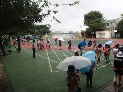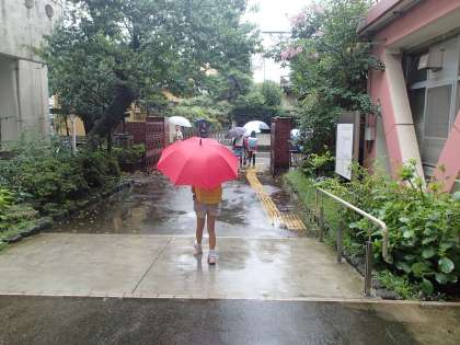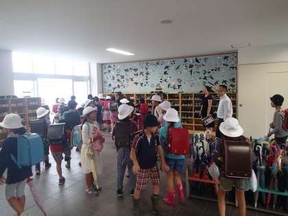 今日は台風の影響のため、1時に一斉に下校しました。その時点では雨は小降りになっていましたが、今後はまた大雨になるかもしれません。行動には注意するようにしてください。