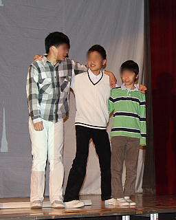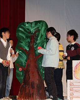 練習時間をたくさんとれなかったので、堂々と演技するところまでいっていませんが、それでも恥ずかしそうにしながらも一生懸命のせりふを述べ演技する子どもたちに惜しみない拍手がわき起こりました。ステージ奥にはなつかしい場面が次々と繰り広げられています。