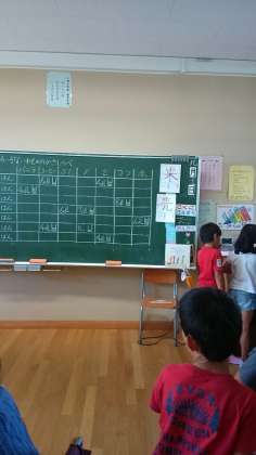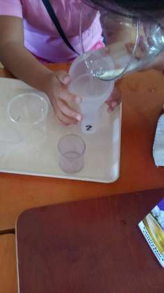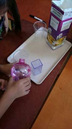 2年生は水のかさ比べをしています。グループで協力しながら入れ物に何dl入るか調べていました。机の上を汚さないように慎重に、水を注いでいました。
