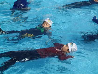 今日は4年生の着衣泳がありました。ようやく訪れた晴天の下。ペットボトルや服の中に空気を入れたりしながら浮く感覚を体験しました。特に頭の後ろにペットボトルを置く体験をしたときには、歓声が上がりました。