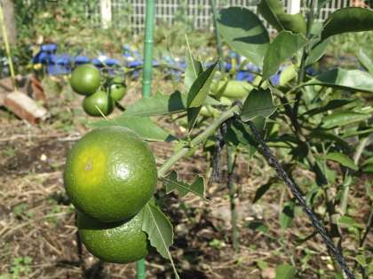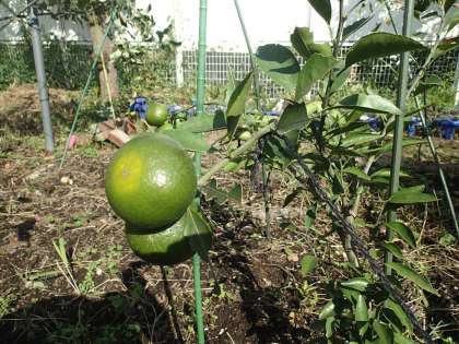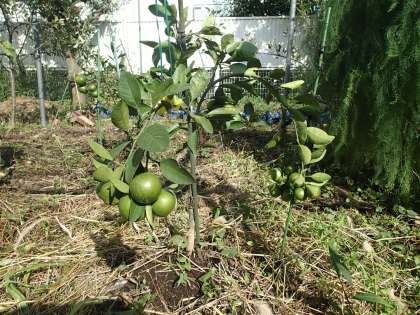今年の冬に植えた早生のミカン。ようやく色づいてきました。あまりたくさんの実をならせてはいけないのですが、今とるのもかわいそうなので・・・。
