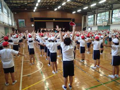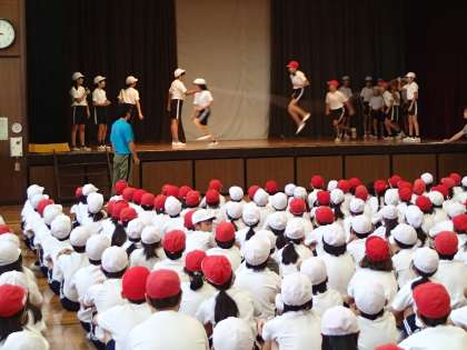本校は長い間、運動会ではID体操、体育の時間はストレッチをやってきました。2年前からラジオ体操を再導入し、指導を始めています。今日は体育朝会でその練習をしました。また休み時間の終わりに長縄の練習も始めます。運動委員会に見本をみせてもらいました。
