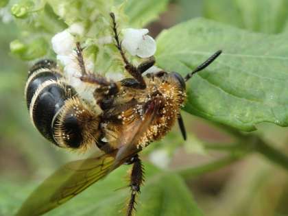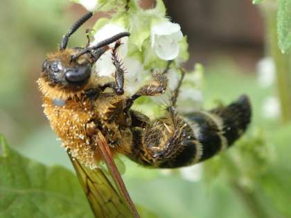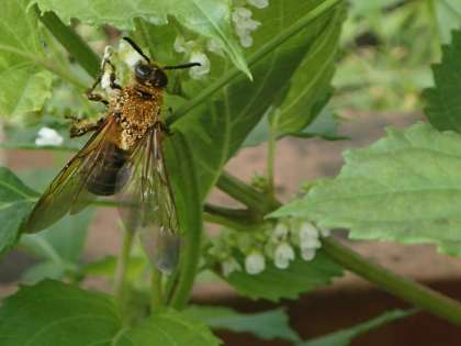 八幡ファームにはたくさんのシソの花が咲いています。そこにいろいろな昆虫がやってきます。その一つがヒメハラナガツチバチです。ちょっと大型の蜂ですが、針はもっていません。ただ、素手で捕まえるとチクッとすることがあります。普通に見ているだけの時はなにもしません。静かに見守ってみてください。