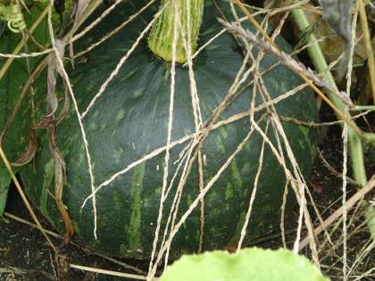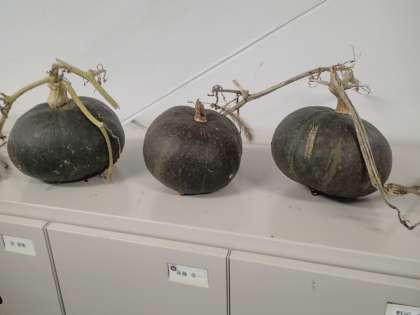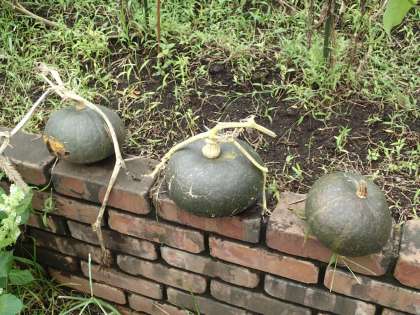 今年の夏に草の中に紛れて育ったのがカボチャ。もう一つ育っています。地面に接していた部分は色が変わりますが、その色と中の色が同じそうです。