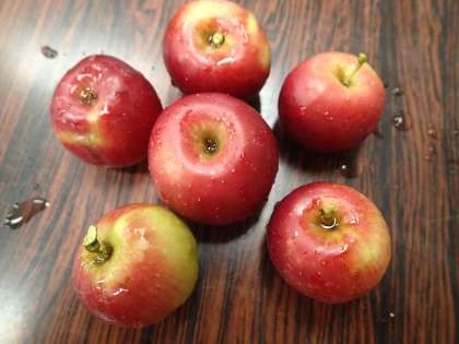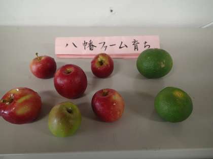 八幡ファームで育っている姫リンゴ、アルプス乙女という種類です。真っ赤になると共に食べても美味しい・・・とのこと。試食してみたくなる美しさですね。