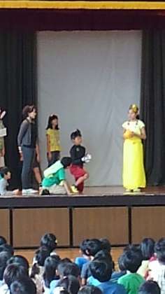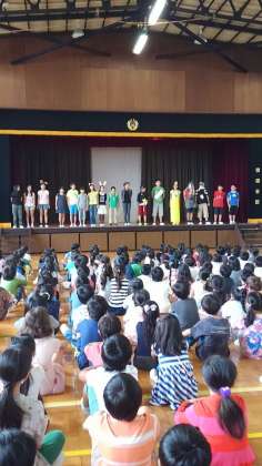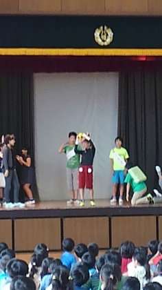 集会委員会が台本から考え、休み時間に集まり、練習した劇を披露しました。笑いあり楽しい内容でした。