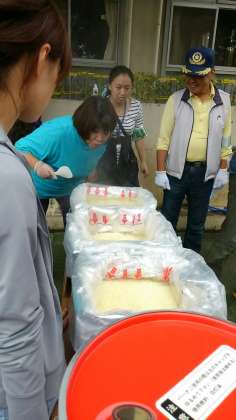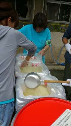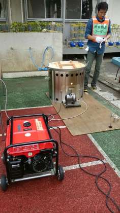 給食物資班はお湯を沸かし、アルファー米を蒸らします。余ったお湯でレトルトカレーを温めます。