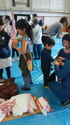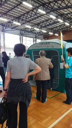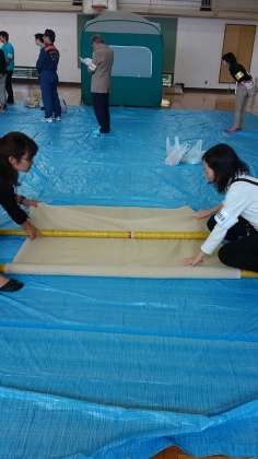 体育館では、災害対策用プライベートルームの照会、担架の作りかた、三角巾の使い方を学びました。