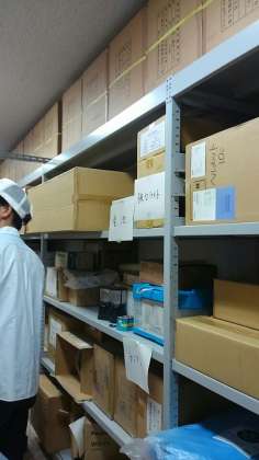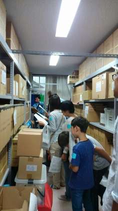 備蓄倉庫の中を見学して、どのくらいの物が入っているか説明を聞きます。1日分の量や、置場所など確認しました。