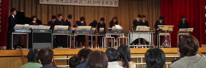 次のプログラムは、八幡中学校C組による合奏です。一生懸命楽器を弾く姿に惜しみない拍手がおくられました。最後は、八幡中学校生徒有志にC組生徒も参加して「校歌」と「そのままの君で」を歌いました。準備、運営をしていただいた青少年九品仏地区委員会の皆様、そして、ご参観いただいた多くの皆様、ありがとうございました。