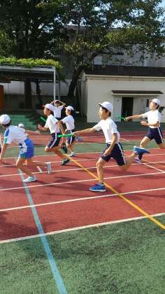 連合運動会に向けて6年生のリレー選手が朝練を始めました。バトンパスが上手になるよう取り組んでいました。