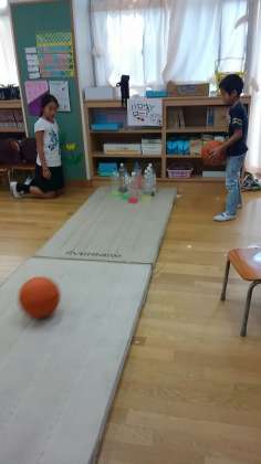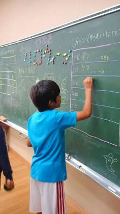 1.2班は、ハロウィンボーリングです。得点を黒板に記録されます。