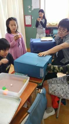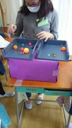 23.24班は、ぱらだいすつかみどりです。箱の中の物を片手で決められた時間内に取ります。おはじきやビー玉などをつかみました。