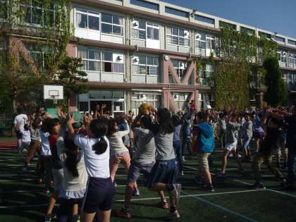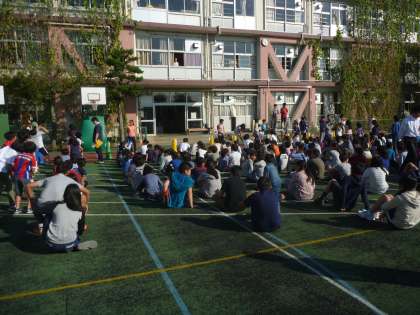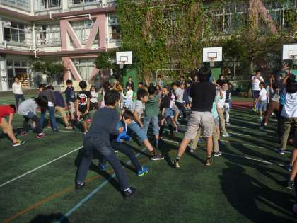 今回はボール送り集会。縦割り班ごとにみんな楽しく参加していました。