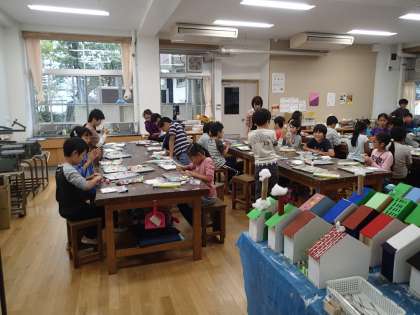 4年の図工の授業、紙粘土で「お気に入りの店」を!